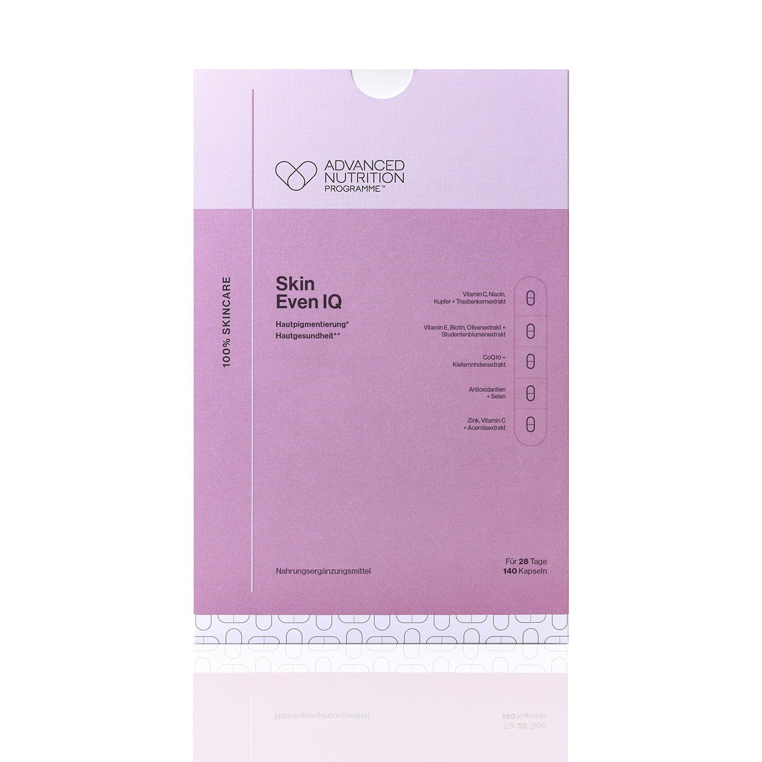 Skin Even IQ wurde sorgfältig kalibriert und erforscht und ist ein wissenschaftlich fundiertes, intelligentes Nahrungsergänzungssystem, das hilft, hartnäckiger Pigmentierung entgegenzuwirken*. Clever verpackt in schützenden Kapseln, haben die ANP Hautforscher ein System zur täglichen Einnahme von fünf intelligenten Kapseln entwickelt: Skin Bright, Skin Blue Filter, Skin Antioxidant, Skin Vit C und Skin Co-Q10+ für einen ebenmäßigen Hautton** und einen strahlenden Teint. Inhalt 144 Kapseln für 28 Tage.