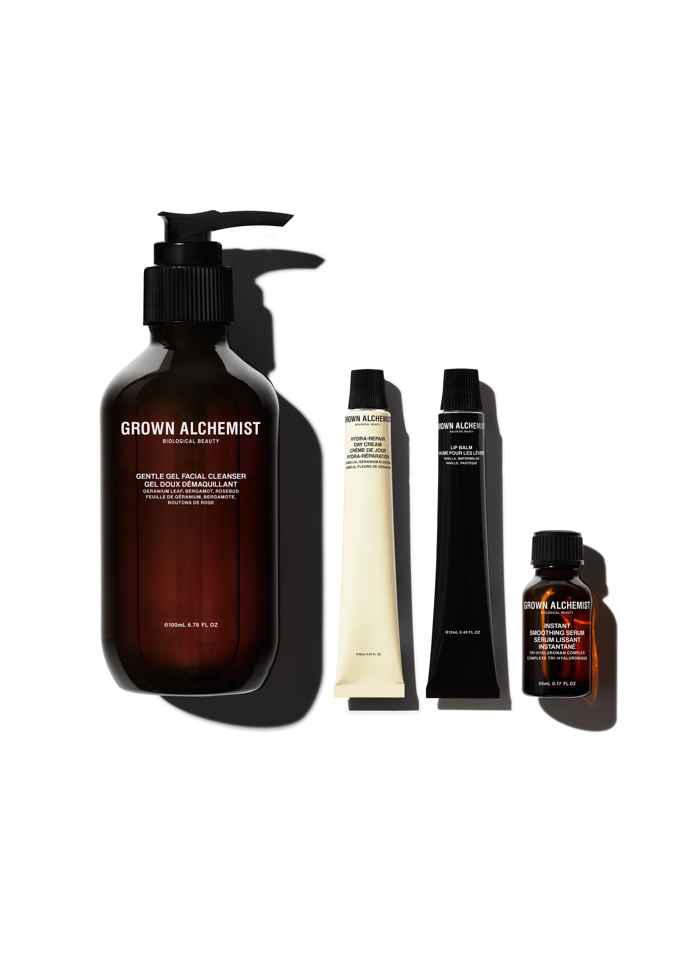 GENTLE GEL FACIAL CLEANSER: Mischen Sie eine etwa fünf Zentimeter große Menge des Gentle Gel Facial Cleanser mit lauwarmem Wasser und massieren Sie es auf das gesamte Gesicht. Mit mehreren Spritzern warmem Wasser abspülen. Morgens und abends anwenden. HYDRA-REPAIR TAGESCREME: Nach der Reinigung mit sanften Aufwärts- und Auswärtsbewegungen von der Mitte des Gesichts, des Halses und des Dekolletés aus auftragen. Drücken Sie die Creme sanft in das Gesicht, damit sie besser einzieht und Feuchtigkeit spendet. Morgens anwenden. INSTANT SMOOTHING SERUM: Nach der Reinigung und Tonisierung der Haut eine kleine Menge sanft in die Haut von Gesicht, Hals und Dekolleté einmassieren. Geeignet für alle Hauttypen. Verwenden Sie es morgens und abends und tragen Sie anschließend Ihre Lieblings-Feuchtigkeitspflege von Grown Alchemist auf.
